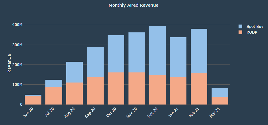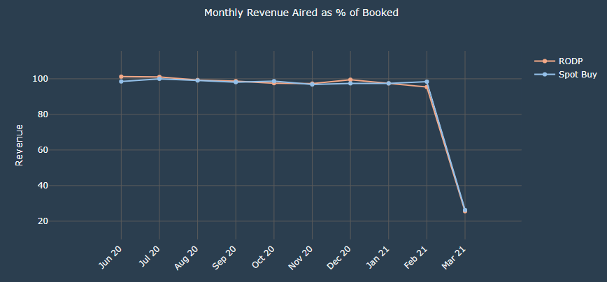 The graph shows the monthly revenue generated as percentage of aired out of booked for selected category