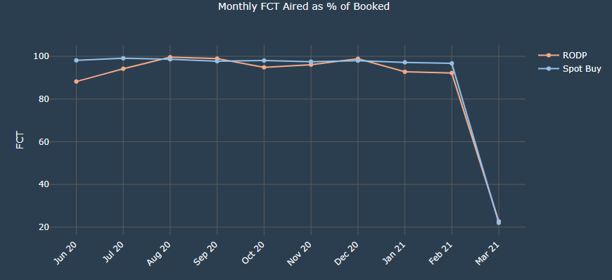 The graph shows the monthly FCT used as percentage of aired out of booked for selected category