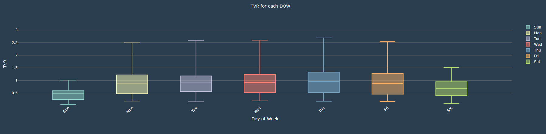 The plot shows the TVR distribution over the period of time. The graph illustrates the minimum, first quartile, median, third quartile, and maximum of the TVR